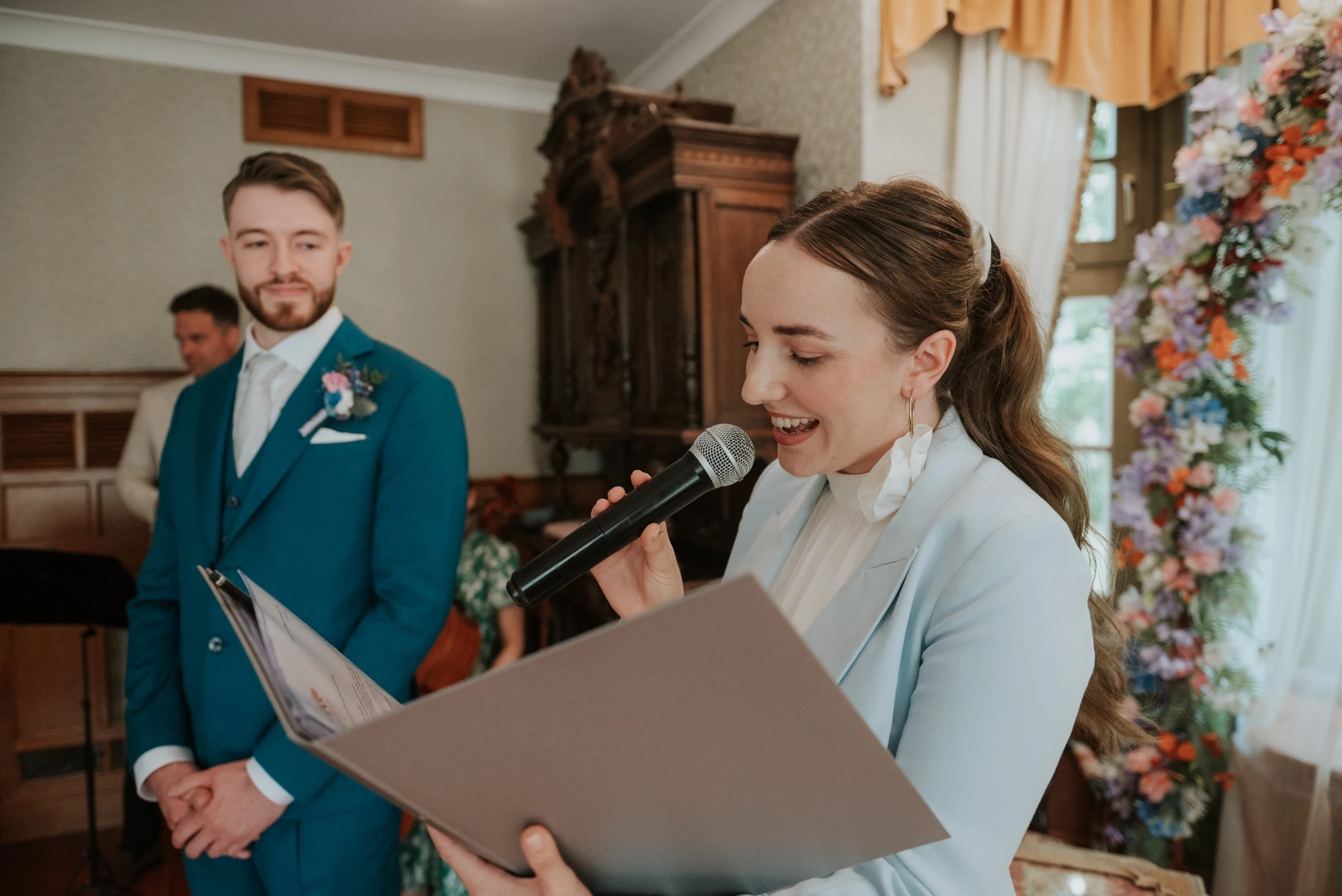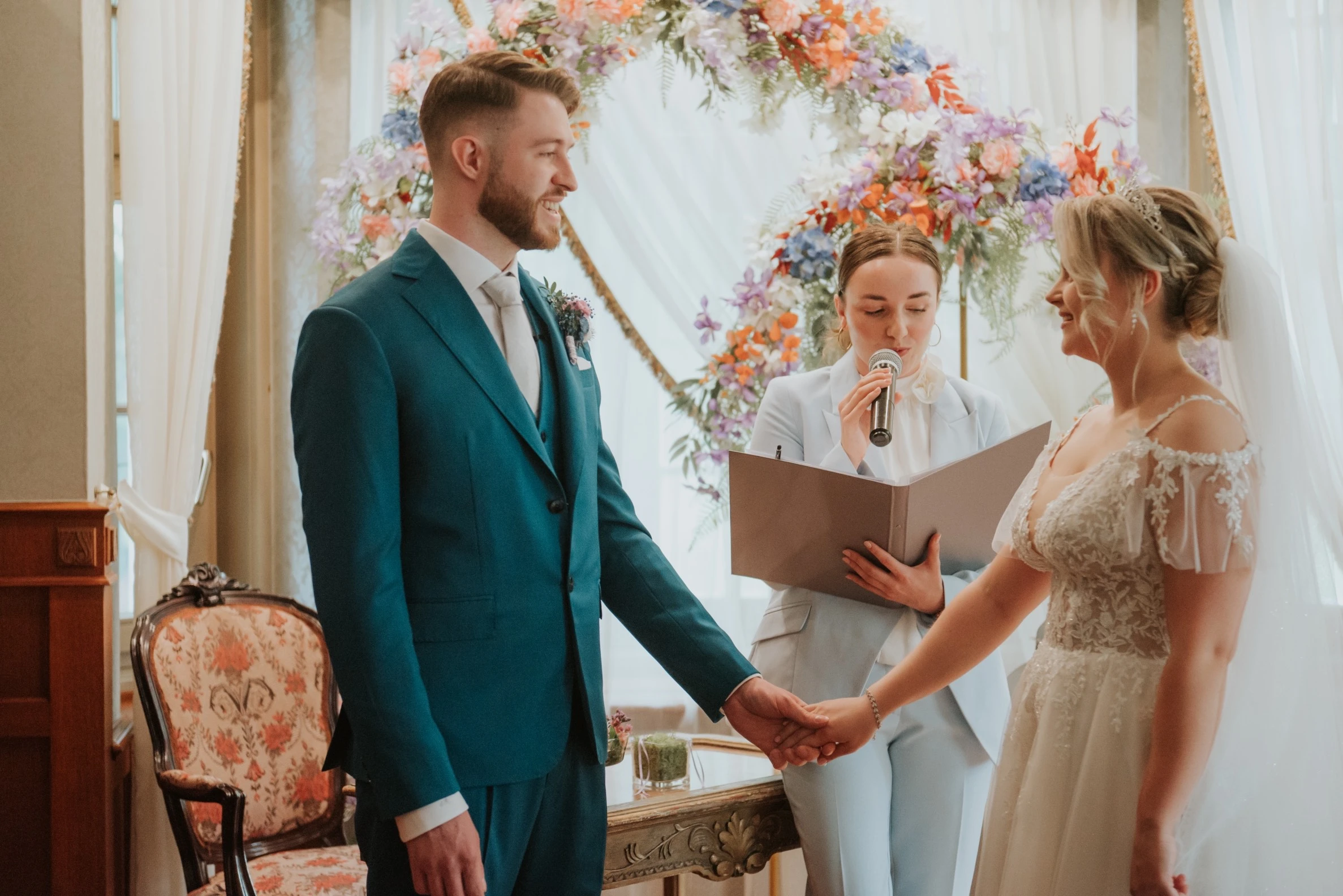 Z ogromną radością towarzyszy nowożeńcom w ich wyjątkowym dniu, dbając o to, by ceremonia była pełna emocji, miłości i wzruszeń – chwilą, która na zawsze pozostanie w ich sercach.